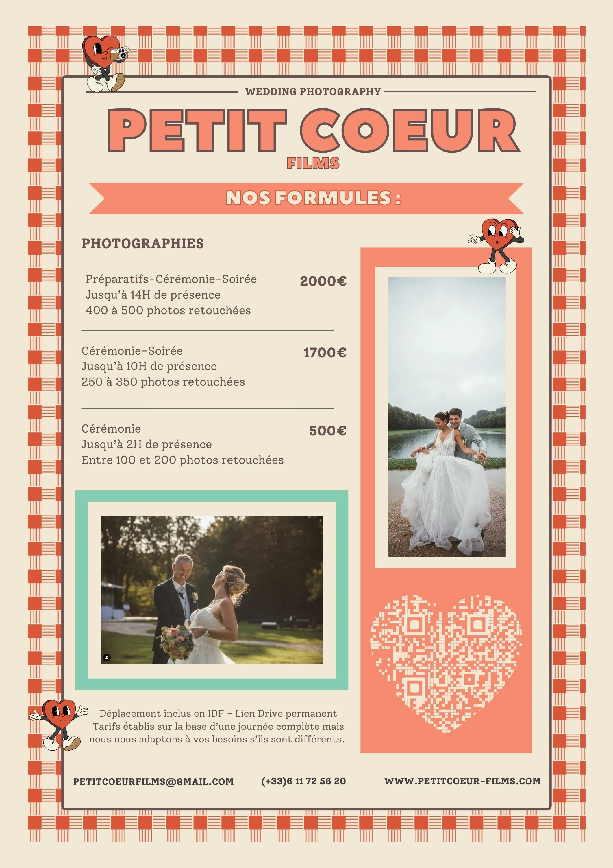 La formule ci-dessous est la formule la plus demandée pour les mariages, mais nous nous adaptons à vos besoins s’ils sont différents. (Temps de présence/Longueur du film/BOX personnalisée…)